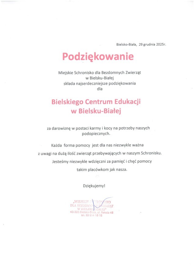 Społeczność Bielskiego Centrum Edukacji aktywnie włączyła się w zbiórkę, przekazując dary zgodne z oficjalną listą akcji, co pozwoliło realnie wesprzeć schronisko i poprawić komfort życia jego podopiecznych. Cieszymy się, że mogliśmy być częścią tej wartościowej inicjatywy i dziękujemy wszystkim, którzy zaangażowali się w pomoc.